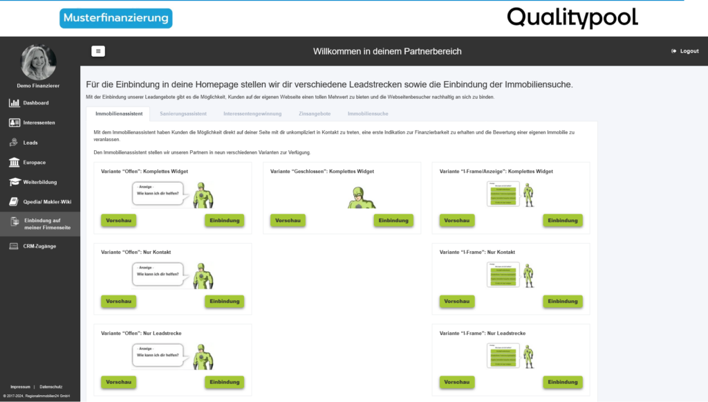 Du möchtest Dein Angebot um die digitale Immobiliensuche erweitern und mehr Potenzial für Dich und Deine Kundschaft heben? Dann teste Finanzierungsassistent24 ab sofort unverbindlich in einem Demo-Account: